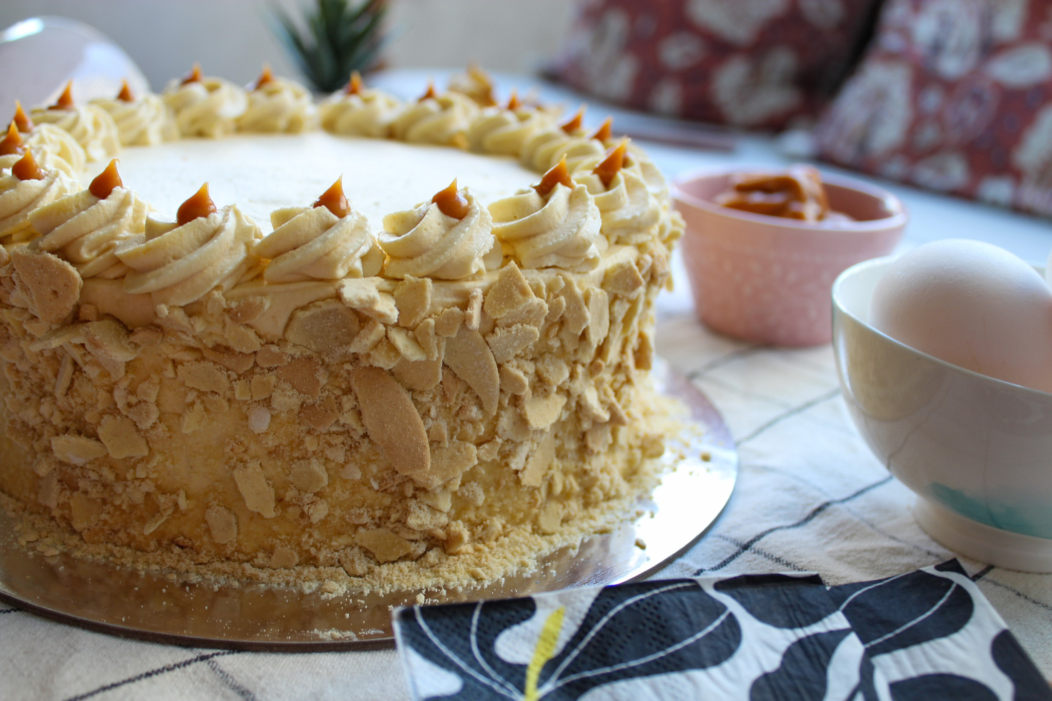 Tota de discos de hojarasca, rellena de manjar, lúcuma, crema pastelera artesanal, cubierta de merengue italiano. Tamaño: 15 cm. de diámetro.