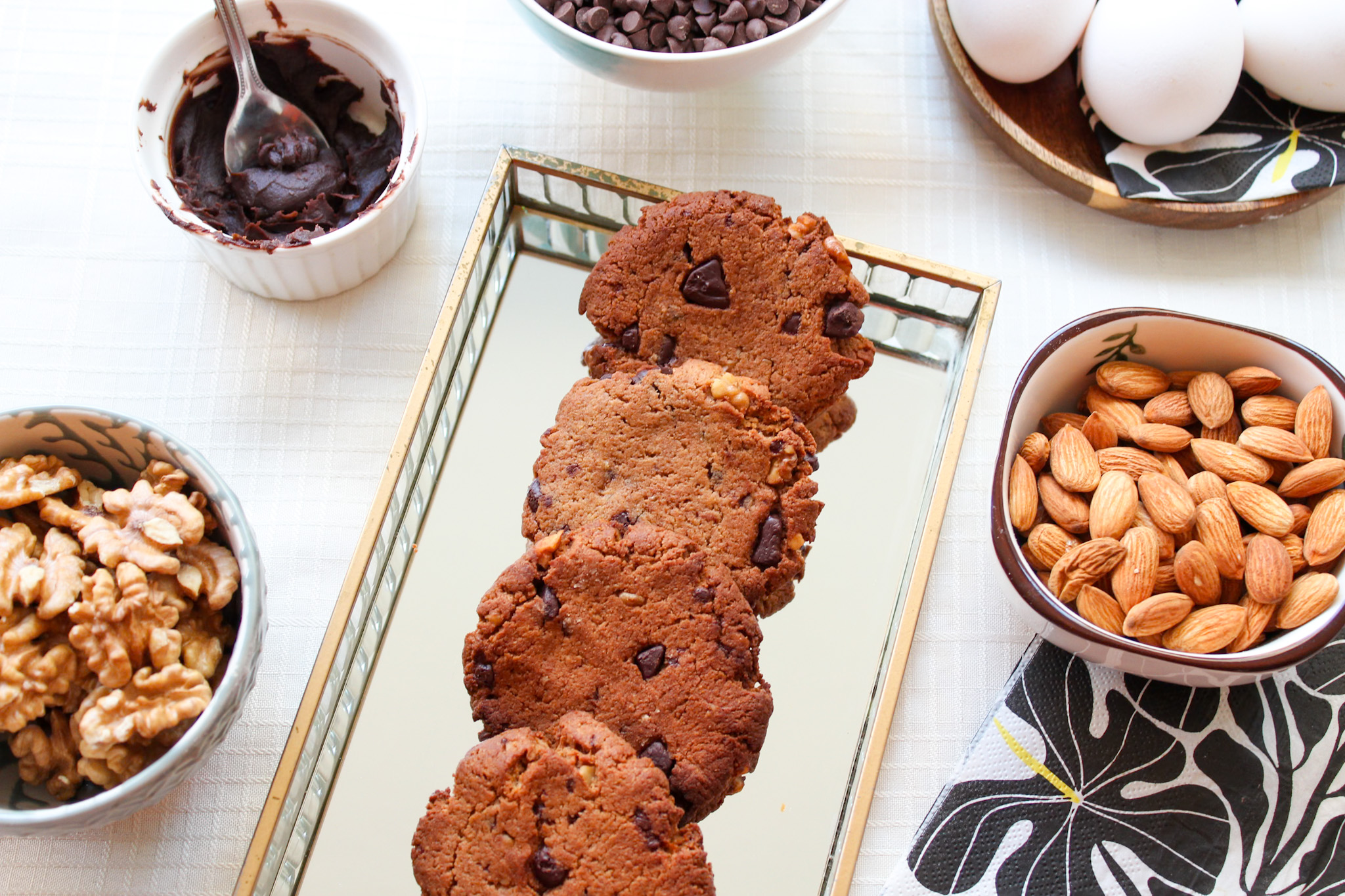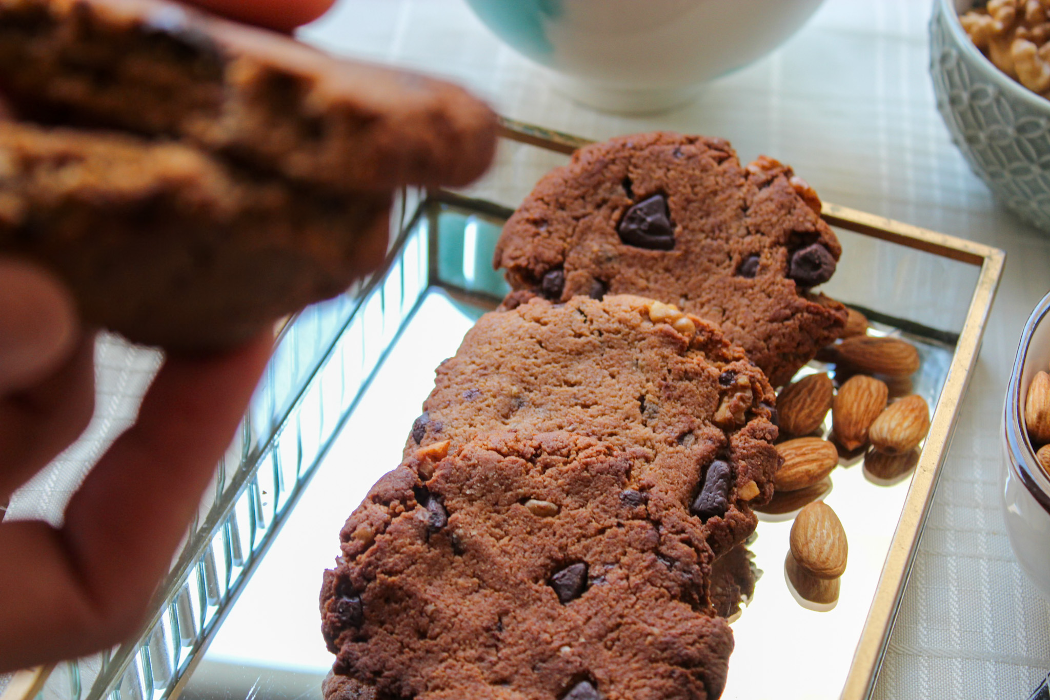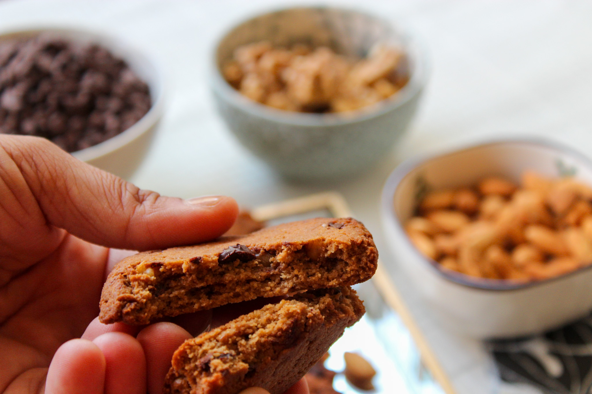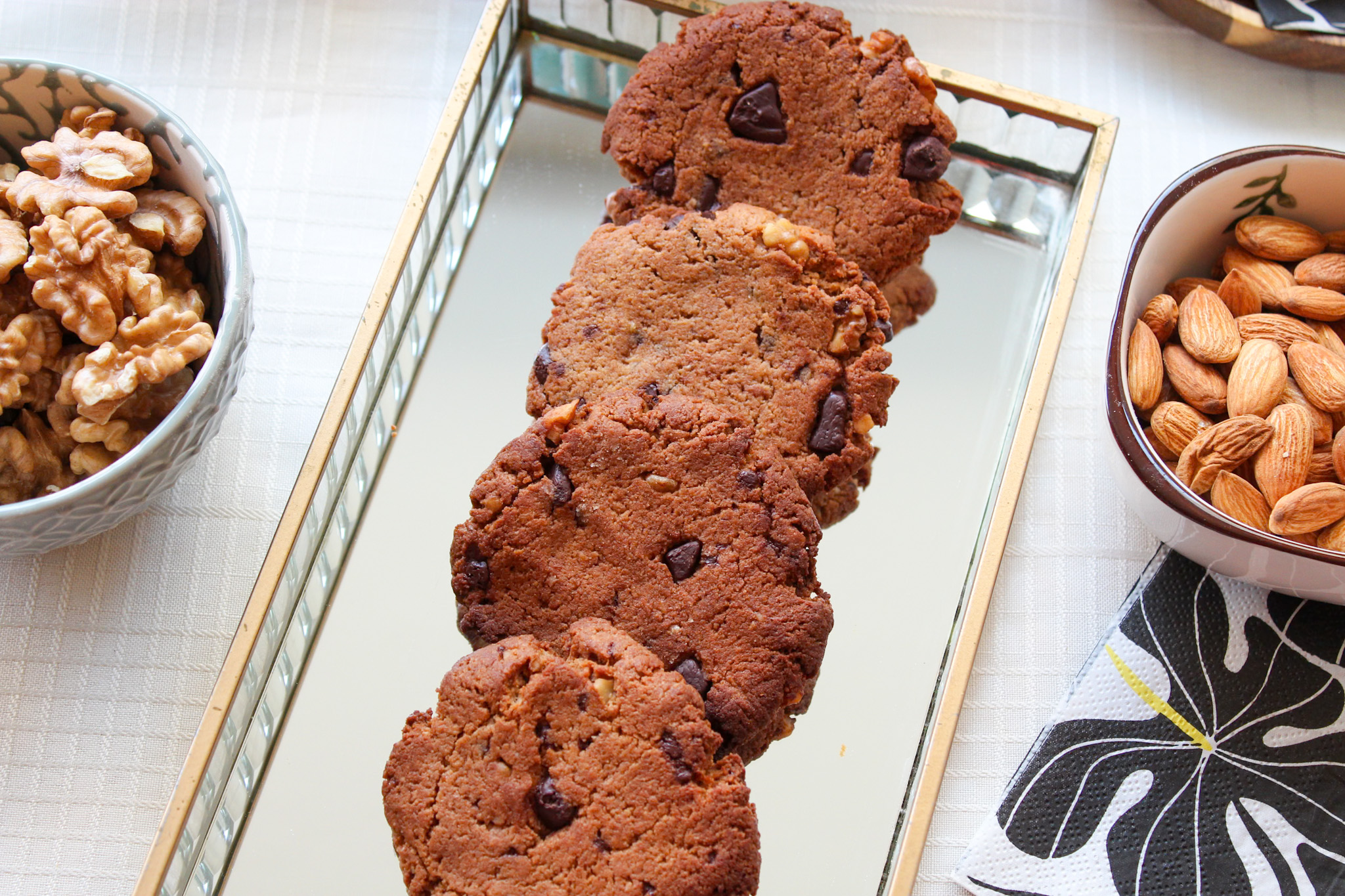 Endulzados con azúcar de coco, preparados con harina de almendras, mantequilla de almendras, huevo, trozos de nueces, y trozos de chocolate al 60% cacao sin azúcar