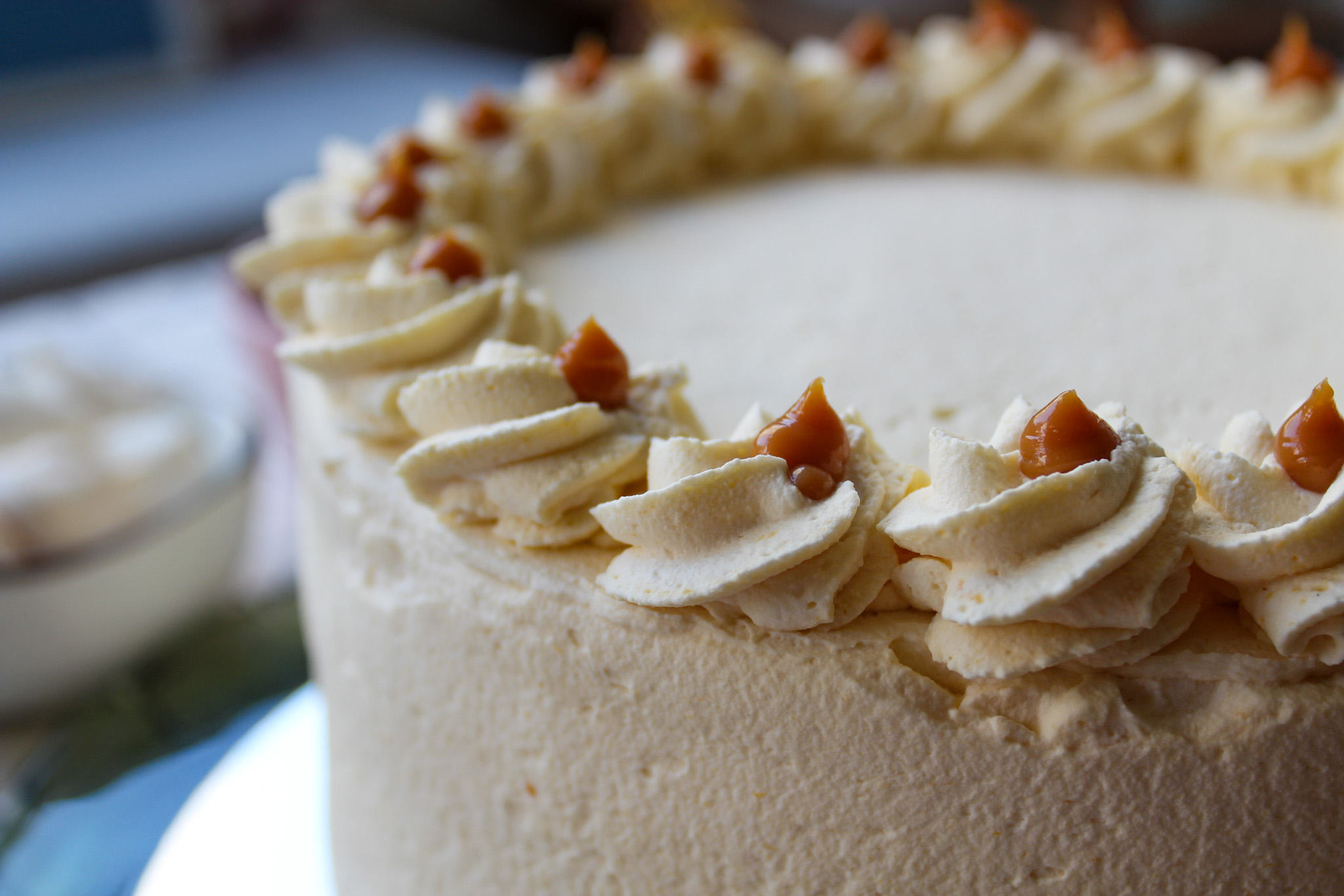 Discos de merengue francés rellenos de crema chantillí de lúcuma y manjar, cubierta con más crema chantillí de lúcuma.