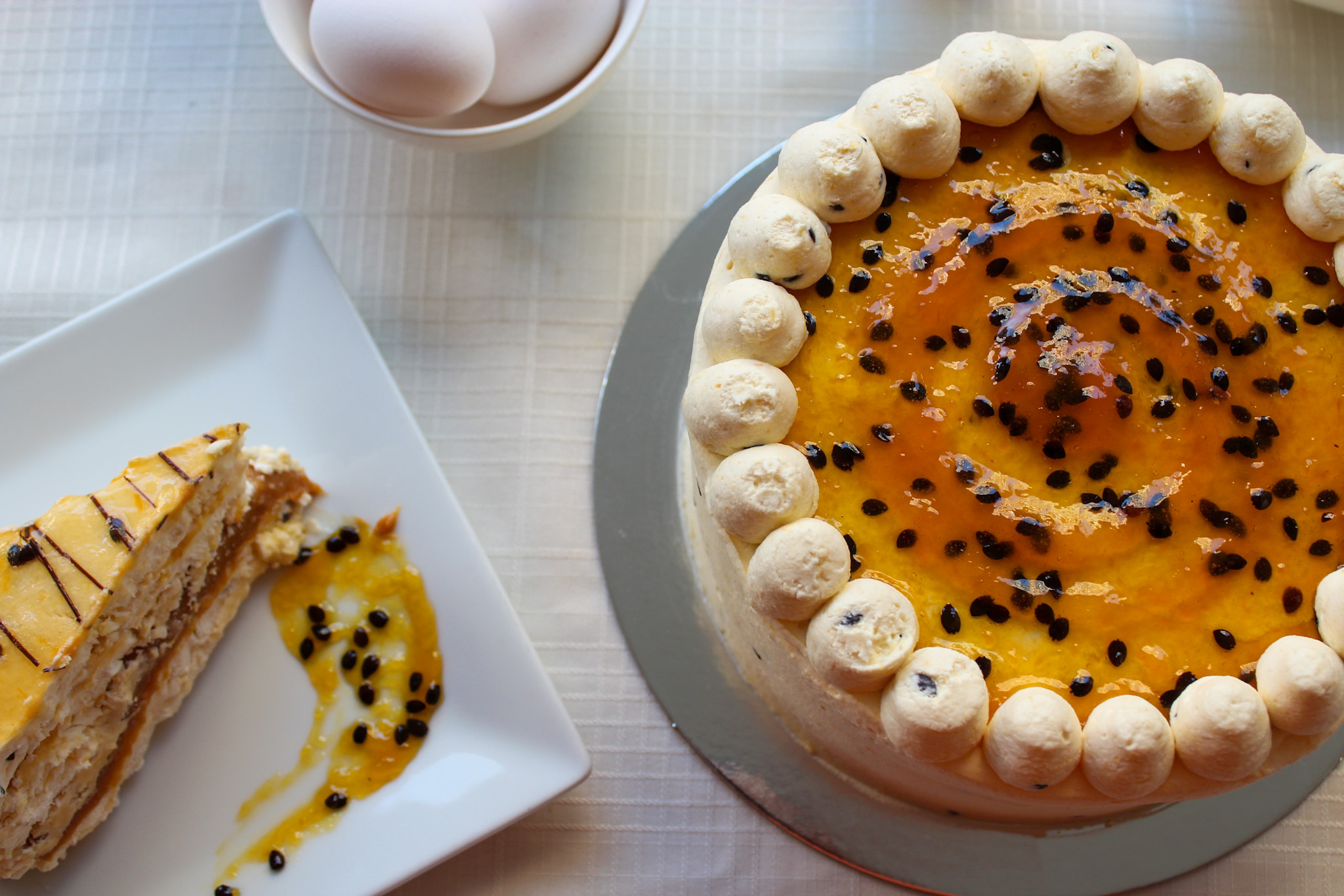 Discos de merengue francés rellenos de crema chantillí, manjar blanco y maracuya, cubierta con más crema chantillí.