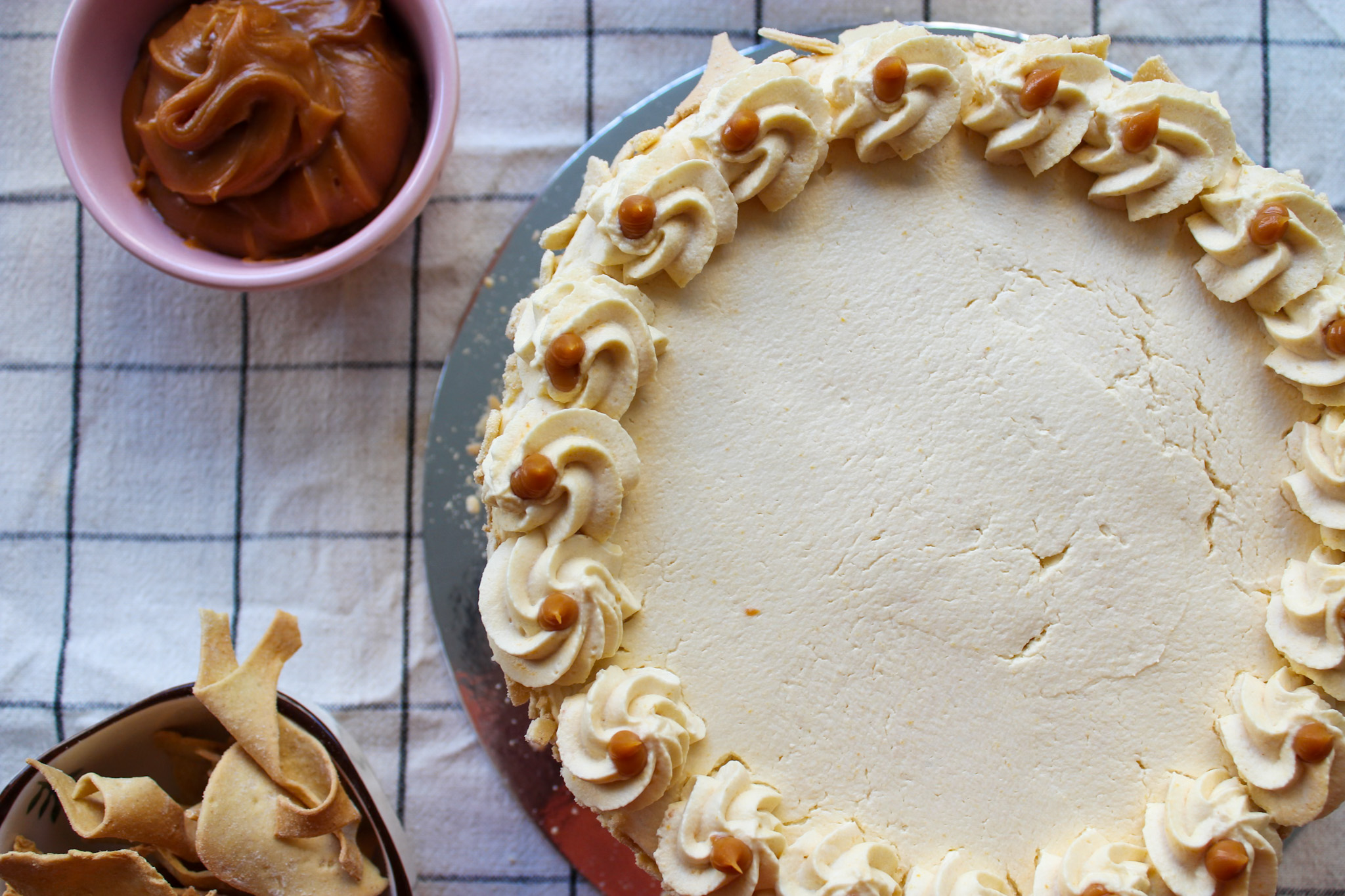 Finas capas de hojarasca rellenas de crema chantillí con pulpa de lúcuma, manjar y nueces picadas. Cubierta de más crema chantillí y decorada con manjar.